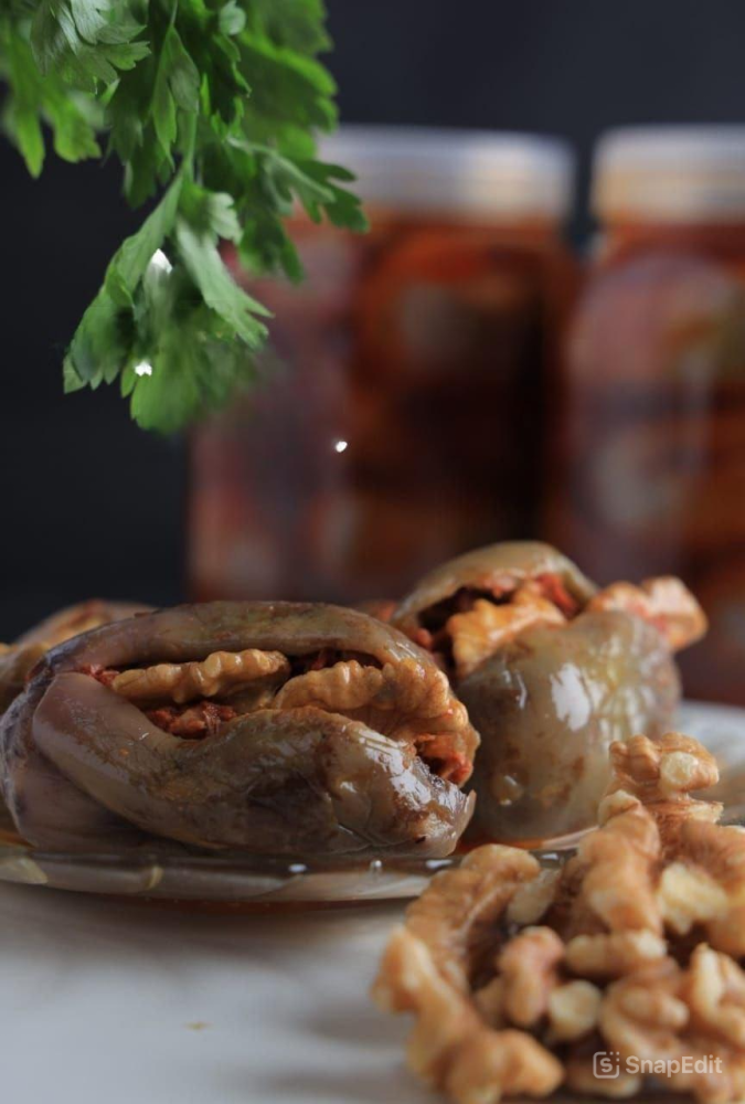 استمتع بمذاق المكدوس السوري المحضر بعناية وفقًا للوصفة التقليدية التي توارثتها الأجيال! 💯✨ يتم اختيار أجود أنواع الباذنجان الصغير وحشوه بخليط لذيذ من الجوز المقرمش، الثوم الطازج، والفلفل الأحمر الحار أو الحلو، ثم يُحفظ في زيت الزيتون البكر الممتاز ليعطيه نكهة غنية وأصيلة.